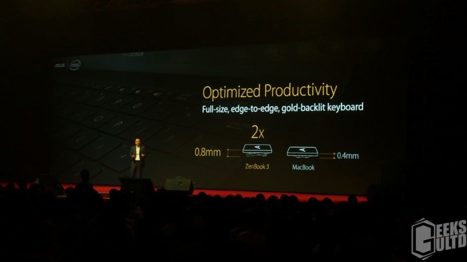 The Zenbook 3 also has double the key travel at 0.8mm compared to the Macbook Pro at 0.4mm, allowing it to have a better typing experience. Not only that, the base Asus Zenbook 3 also supports Windows Hello and has a fingerprint scanner embed into it’s touchpad. Some other features that Asus touted at the event was the super thin design they were able to pull of, weighing in at 910g and 11.7mm in width, this thing was surely light and thin.