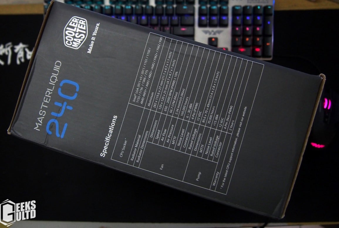 Cooler Master has definitely shook a bit from their Pro 240mm box design here. Other than that, you can have a glace at the cooler design. Cooler Master has gone beans here when it comes to designing their boxes by implementing the trendy material-like color scheme on their packaging.