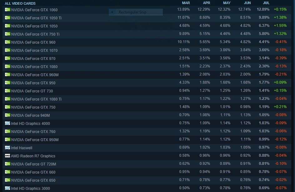 In the above chart we can clearly see that AMD is nowhere to be seen and the GTX 1060 is leading all the way. The survey also suggests that Nvidia seems to be the better choice for gamers as a whole and clearly dominates over AMD. The real question here however is that even after the new VEGA architectur by AMD they are nowhere to be found.