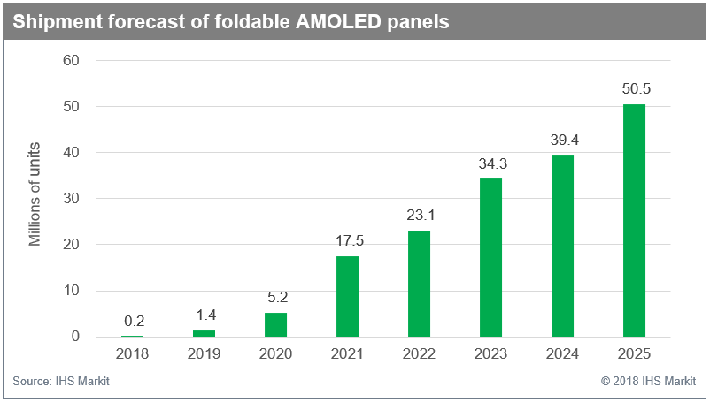 The report published by the team at IHS Market suggests that by 2025, demand for flexible AMOLED panels would cross the 50 Million mark and that it could continue to grow exponentially over the next few years. Their report notes that 2018 would begin with 0.2 Million units followed by major bursts of demands over the course of the next few years. As you may note, the demand for such panels would be immense over the next few years, especially throughout 2019, 2020 and 2021. Following those years, the demand for such flexible AMOLED panels would begin to stabilize as the market catches up with the whole idea. Below, is the forecast of IHS Markit’s report that showcases the demand for foldable AMOLED panels.