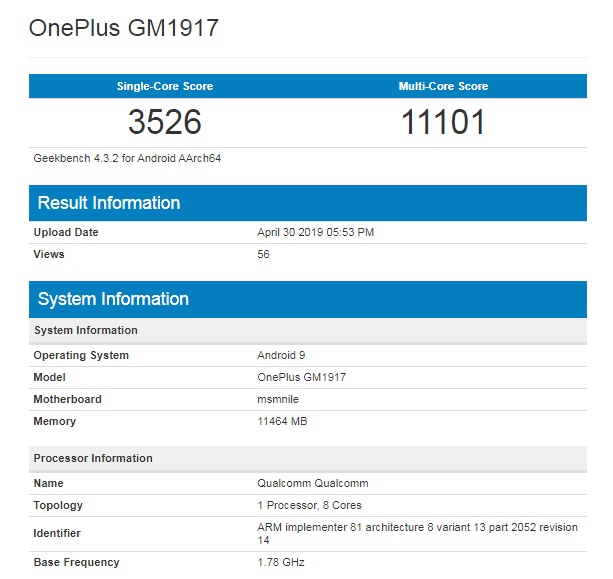 After weeks of leaks and rumors, the OnePlus 7 Pro has finally made its way to Geekbench’s database. The alleged benchmark of the OnePlus 7 Pro has appeared as the GM1917 on Geekbench, revealing and confirming the inclusion of 12GB of RAM and the Snapdragon 855 SoC.