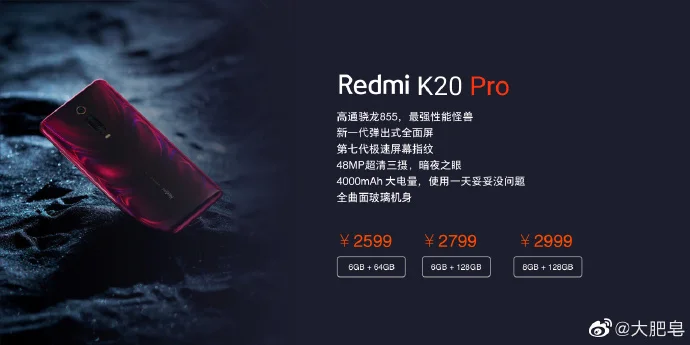 - Xiaomi Redmi K20 Pro (8GB RAM / 128GB) – Â¥2999(US $434)