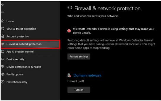2-Navigate to windows protection within the left pane and then select Firewall & network protection option.
