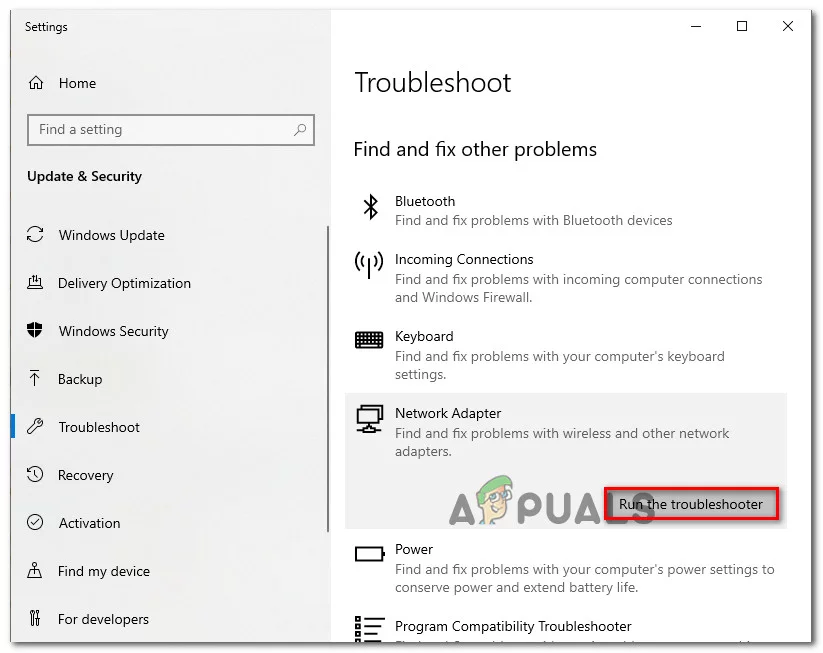 Locate the Troubleshoot option, choose Network Adapter, and then click the Run the troubleshooter button.