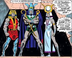 He is also adored by the Wakandan people, who position him among the Orisha pantheon of gods, as the wisest of the Egyptian gods. Thot has been in a number of issues with the pantheon, which first appeared in The Avengers #117.