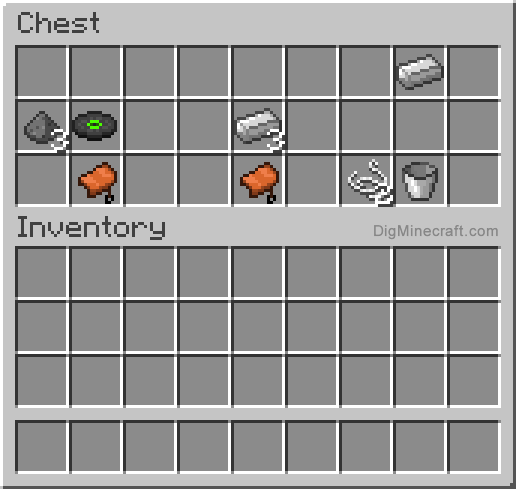 Saddles, a music disc, iron ingot, gunpowder, twine, and a bucket are all found in this illustration.