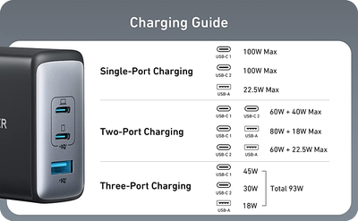 If all three ports are used, the top USB-C port will provide 45 watts, the bottom USB-C port will provide 30 watts, and the USB-A port will provide 18 watts.