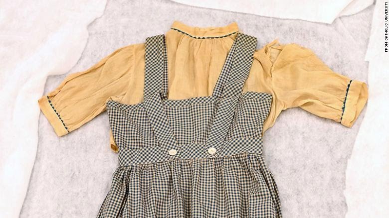 The dress is unique because this blue pinafore dress has a “handkerchief pocket”. The dress is fitted with a bodice and a full skirt. The dress has the tag Judy Garland 4223. In 2015, another Judy Garland dress was sold for $1.5 million at a Bonhams auction.