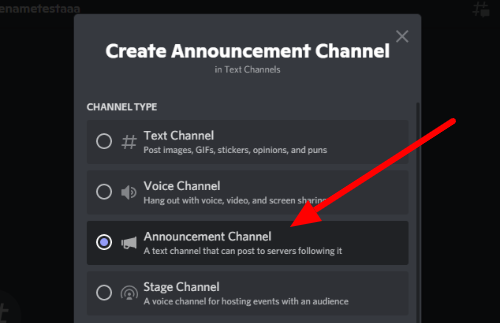 As soon as the pop-up box shows on your screen, navigate to the Channel Type area and pick Announcement Channel.