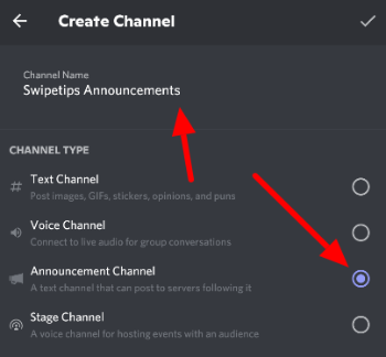 Create a channel name and choose the Announcement Channel option as the channel’s type.