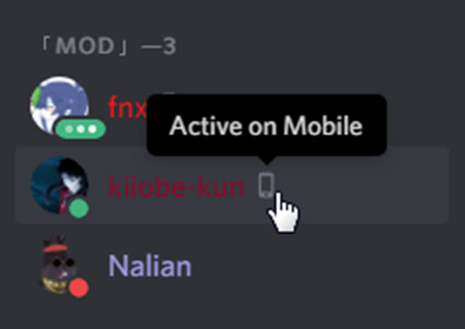 The mobile Presence icon will display beside a person’s name everywhere a random user appears, regardless of whether or not it’s in a server’s Member’s lineup, inside the person’s profile, or anywhere else.