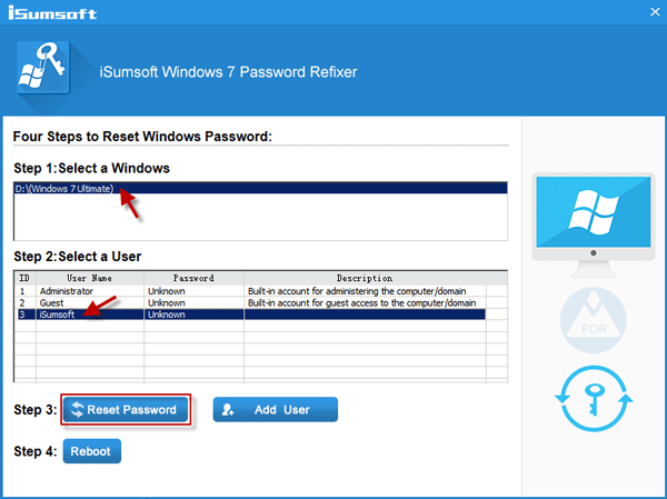 Open the Windows 7 Password Refixer programme and reset your Windows 7 password. Burn it on a USB/CD/DVD flash drive by following its instructions. You must first consent to have your USB or CD/DVD media formatted before you can begin burning.