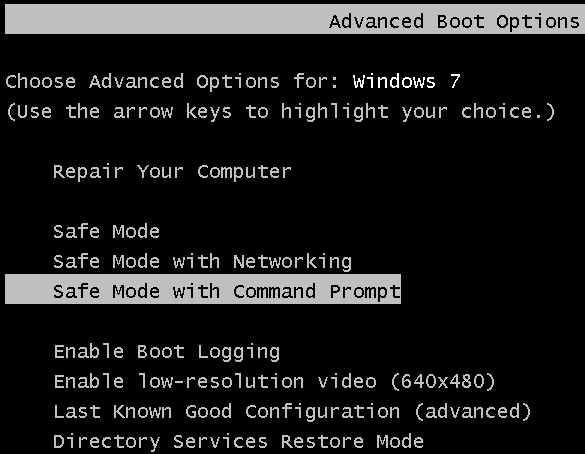 Using the “and “keys, select Safe Mode with Command Prompt.