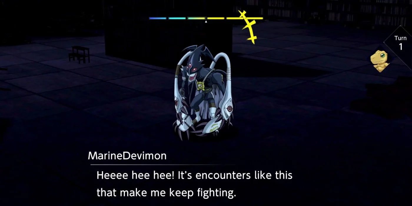 Although it occasionally appears in chance shadow encounters in Part 7, the Free Battle area at the Library Area during Part 10 is the first place where players can consistently see MarineDevimon.