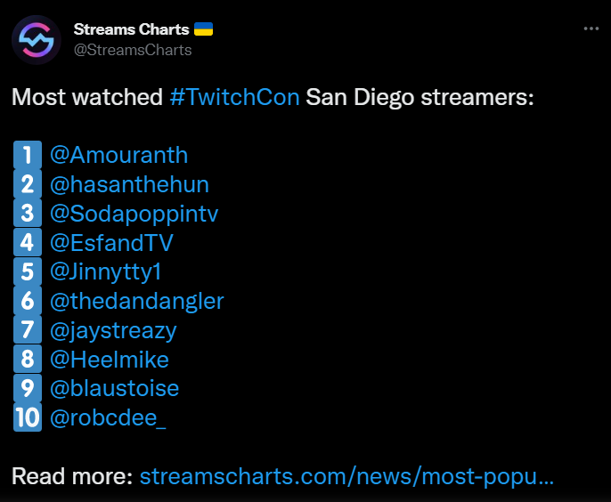Amouranth managed to surpass the competition and take the top spot for the most hours watched during TwitchCon, according to a Tweet that was posted by the official account of Streams Charts, a company that offers statistical information about how many people watch content on various streaming platforms Amouranth’s viewers watched nearly 60,000 more hours of her stream than her closest competitor, with just under 436,000 hours watched over the three-day convention.