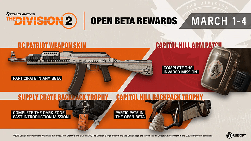 Participating in the beta alone will get you goodies to keep like the ‘DC Patriot weapon skin’ and the ‘Capitol Hill backpack trophy’. Complete the Invasion Mission and the Dark Zone East introduction mission and earn yourself a Capitol Hill arm patch and a Supply Crate backpack trophy. Lastly, complete a certain set of tasks in-game and you will unlock rewards that you’ll be able to access in the full game.